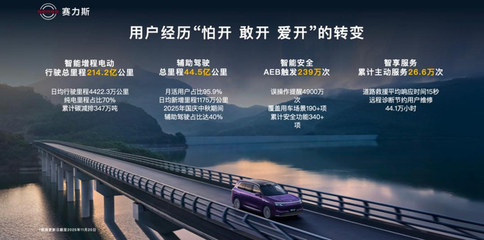 2. 问界智能辅助驾驶的理念,是帮助用户对智驾辅助从怕开到敢开,再到爱开、离不开。截止上个月(2025年11月),问界的智能辅助驾驶已经为用户保驾护航超过44.5亿里程,每日新增智能辅助驾驶的里程达1175万公里。