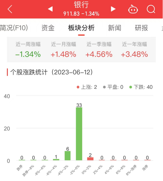 中国经济网北京6月12日讯今日,银行板块整体跌幅1.34%,其中2只股票上涨,0只股票平盘,40只股票下跌。