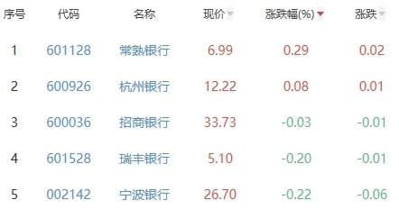 其中,常熟银行、杭州银行、招商银行、瑞丰银行、宁波银行位列板块涨幅前五位,涨幅分别为0.29%、0.08%、-0.03%、-0.20%、-0.22%。