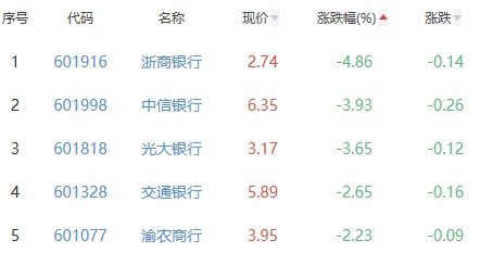 浙商银行、中信银行、光大银行、交通银行、渝农商行位列涨幅榜后五位,涨幅分别为-4.86%、-3.93%、-3.65%、-2.65%、-2.23%。
