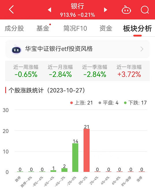 数据显示,截至今日,银行板块近一周涨幅-0.65%,近一月涨幅-2.84%,近一季涨幅-2.84%。