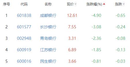 成都银行、长沙银行、青岛银行、江苏银行、民生银行位列涨幅榜后五位,涨幅分别为-4.90%、-3.08%、-2.36%、-1.85%、-0.81%。
