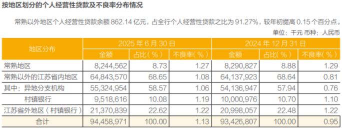 证券之星注意到,为突破本地市场天花板,常熟银行曾尝试将业务重心向异地转移,2025年上半年常熟以外地区个人经营性贷款余额达862.14亿元,占全行该类贷款的91.27%。但异地管理能力似乎未能同步跟进,导致风险敞口扩大:个人经营性贷款方面,常熟以外江苏省内地区不良率从0.81%升至1.08%,江苏省外地区虽稳定在1.22%,但显著高于本地1.27%的水平。