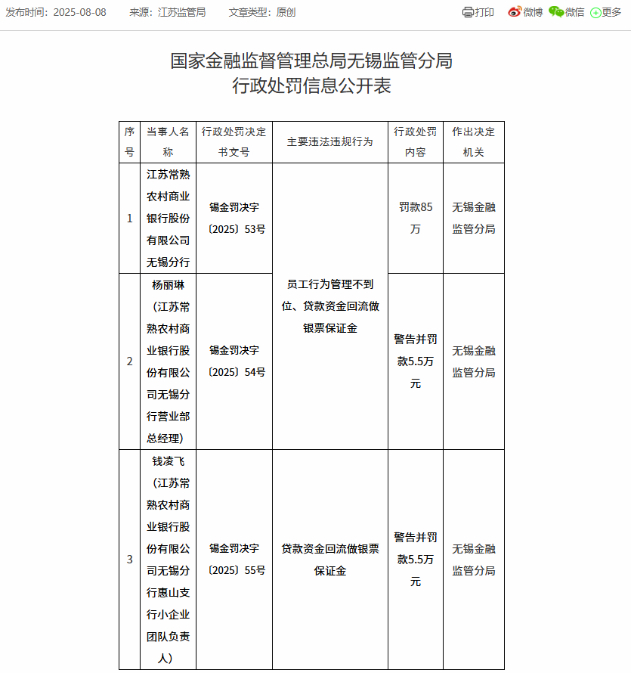 罚单显示,常熟银行无锡分行的主要违法违规行为包括员工行为管理不到位、贷款资金回流做银票保证金,国家金融监督管理总局无锡监管分局对其罚款85万元;时任营业部总经理杨丽琳因相同事由被警告并处罚款5.5万元。此外,时任惠山支行小企业团队负责人钱凌飞因贷款资金回流做银票保证金,被警告并处罚款5.5万元。