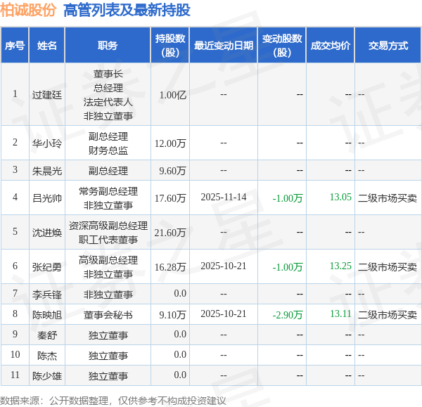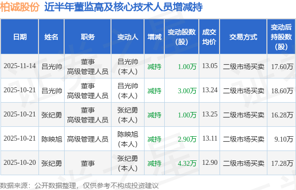 柏诚股份近半年内的董监高及核心技术人员增减持详情如下: