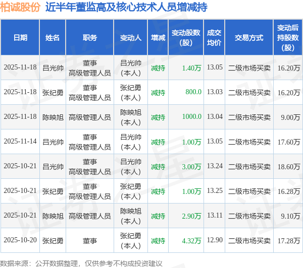 柏诚股份近半年内的董监高及核心技术人员增减持详情如下: