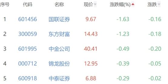 国联证券、东方财富、中金公司、锦龙股份、中泰证券位列涨幅榜后五位,涨幅分别为-1.63%、-1.23%、-0.49%、-0.39%、-0.29%。