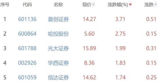 其中,首创证券、哈投股份、光大证券、华西证券、信达证券位列板块涨幅前五位,涨幅分别为3.71%、2.75%、1.99%、1.83%、1.74%。