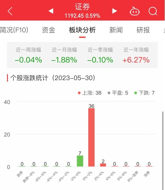 中国经济网北京5月30日讯今日,证券板块整体涨幅0.59%,其中38只股票上涨,5只股票平盘,7只股票下跌。