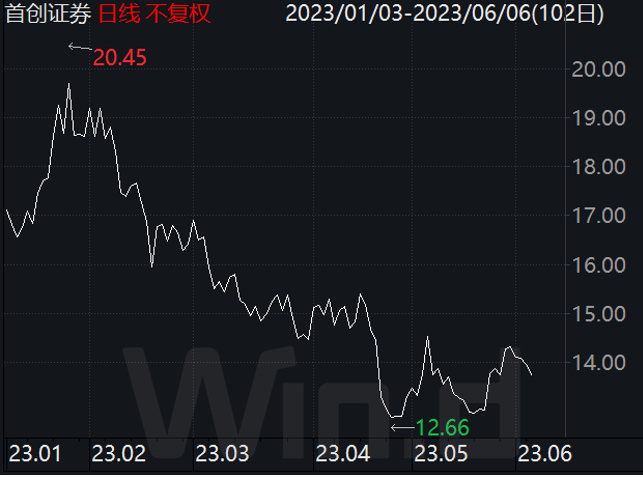 Wind数据显示,截至6月6日收盘,首创证券股价年内下跌21.18%,为A股上市券商最差表现。