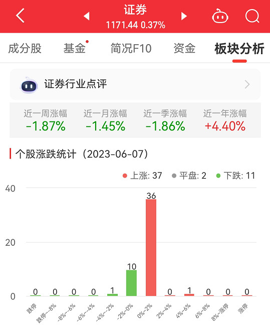 中国经济网北京6月7日讯 今日,证券板块整体涨幅0.37%,其中,37只股票上涨,2只股票平盘,11只股票下跌。