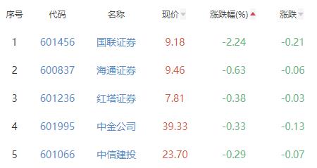 国联证券、海通证券、红塔证券、中金公司、中信建投位列涨幅榜后五位,涨幅分别为-2.24%、-0.63%、-0.38%、-0.33%、-0.29%。