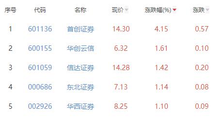 其中,首创证券、华创云信、信达证券、东北证券、华西证券位列板块涨幅前五位,涨幅分别为4.15%、1.61%、1.42%、1.14%、1.10%。