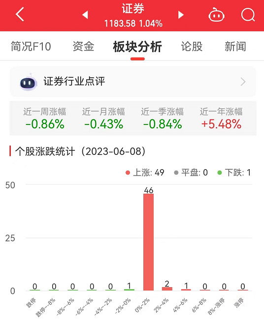 中国经济网北京6月8日讯 今日,证券板块整体涨幅1.04%,其中,49只股票上涨,1只股票下跌。