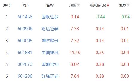 国联证券、财达证券、湘财股份、中国银河、国盛金控、红塔证券位列涨幅榜后五位,涨幅分别为-0.44%、0.14%、0.14%、0.35%、0.38%、0.38%。