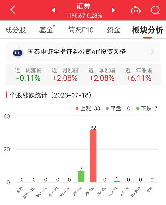 中国经济网北京7月18日讯 今日,证券板块整体涨幅0.28%,其中,33只股票上涨,10只股票平盘,7只股票下跌。