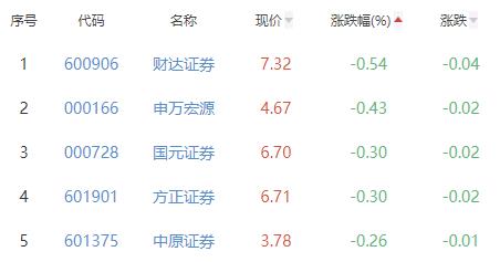 财达证券、申万宏源、国元证券、方正证券、中原证券位列涨幅榜后五位,涨幅分别为-0.54%、-0.43%、-0.30%、-0.30%、-0.26%。