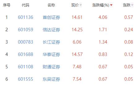 其中,首创证券、信达证券、长江证券、华泰证券、财通证券、东吴证券位列板块涨幅前五位,涨幅分别为4.06%、1.71%、1.34%、0.83%、0.67%、0.67%。