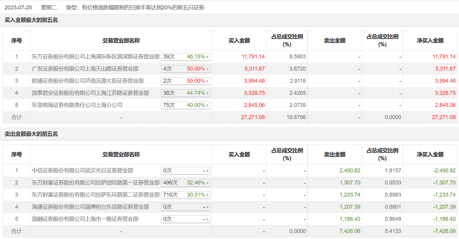 具体来看,知名游资现身龙虎榜,章盟主(国泰君安证券股份有限公司上海江苏路证券营业部)净买入3328.75万元。此外,东方证券上海浦东新区源深路证券营业部、广发证券上海天山路证券营业部分别买入1.18亿元、5311.67万元;中信证券武汉光谷证券营业部、东方财富证券拉萨团结路第一证券营业部分别卖出2490.82万元、1307.70万元。