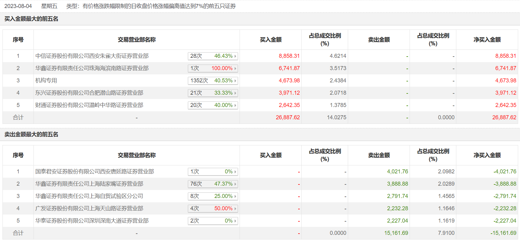 首创证券8月4日涨停,龙虎榜数据显示,上榜营业部席位全天成交4.2亿元,占当日总成交金额比例为21.94%。其中,买入金额为2.69亿元,卖出金额为1.52亿元,合计净买入1.17亿元。