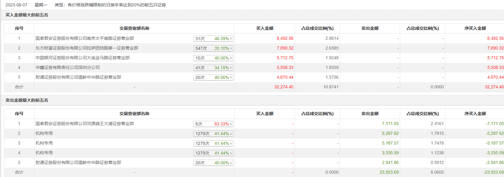 今日涨停,成交额29.68亿元,换手率45.72%,盘后龙虎榜数据显示,三机构专用席位净卖出1.38亿元。