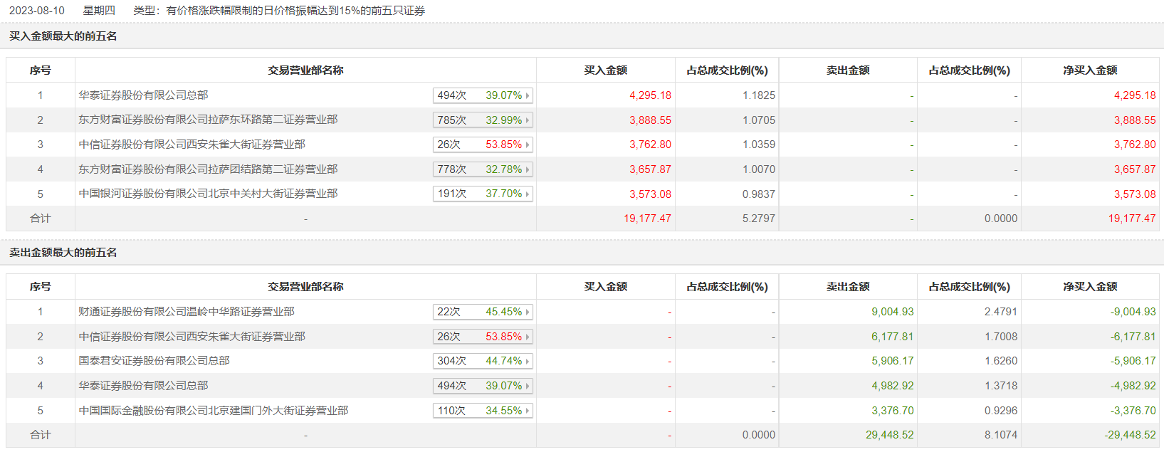 具体来看,知名游资现身龙虎榜,华泰证券总部、东方财富证券拉萨东环路第二证券营业部分别买入4295.18万元、3888.55万元;财通证券温岭中华路证券营业部、方新侠(中信证券西安朱雀大街证券营业部)分别卖出9004.93万元、6177.81万元。