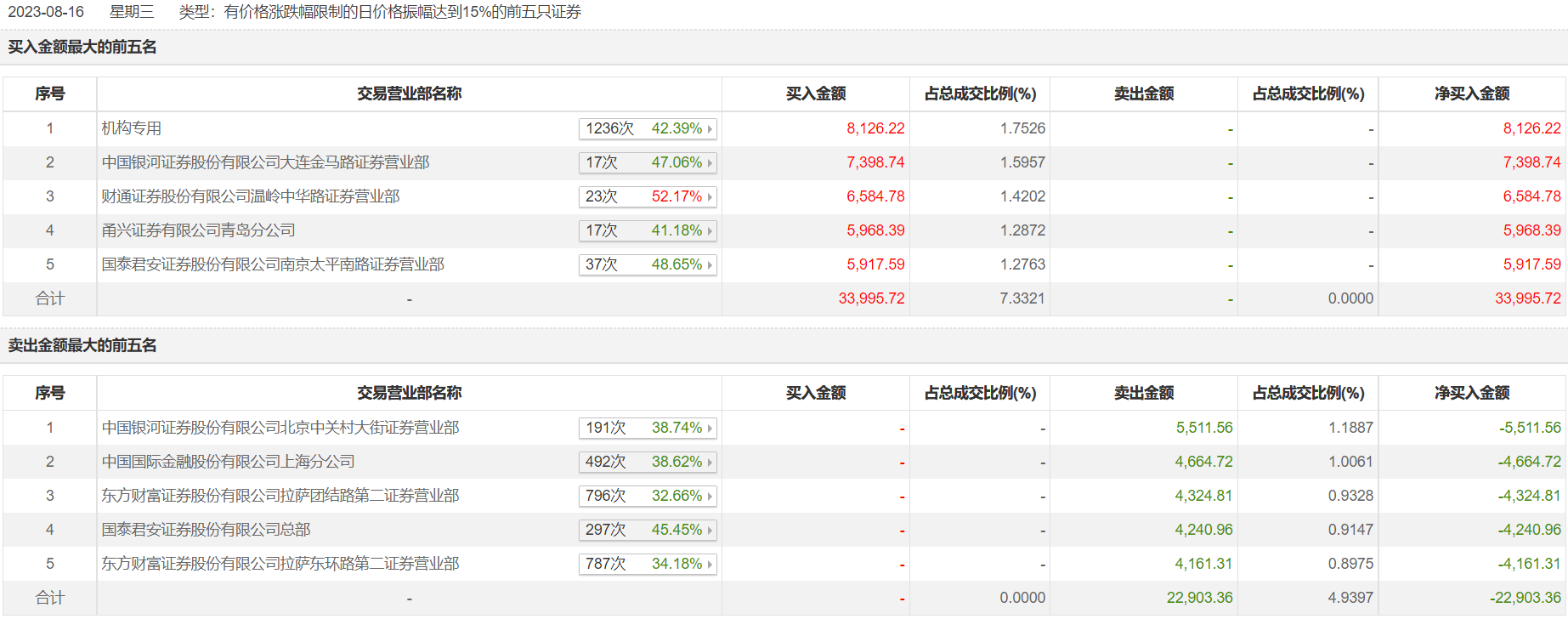 具体来看,机构合计净买入8126.22万元。此外,知名游资现身龙虎榜,作手新一(国泰君安证券股份有限公司南京太平南路证券营业部)净买入5917.59万元。此外,中国银河证券大连金马路证券营业部、财通证券温岭中华路证券营业部分别买入7398.74万元、6584.78万元;中国银河证券北京中关村大街证券营业部、中国国际金融上海分公司分别卖出5511.56万元、4664.72万元。