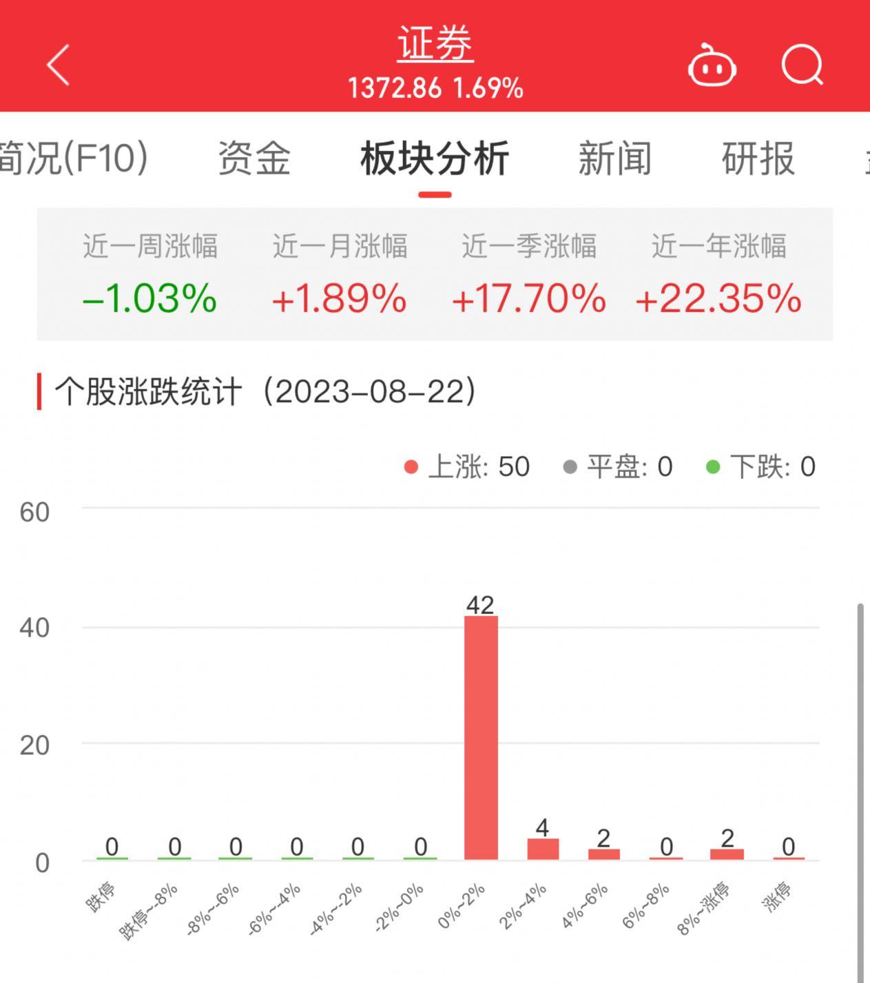 中国经济网北京8月22日讯 今日,证券板块整体涨幅1.69%,其中50只股票上涨。