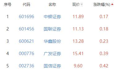 中银证券、国联证券、华鑫股份、广发证券、国信证券位列涨幅榜后五位,涨幅分别为0.17%、0.18%、0.23%、0.39%、0.42%。