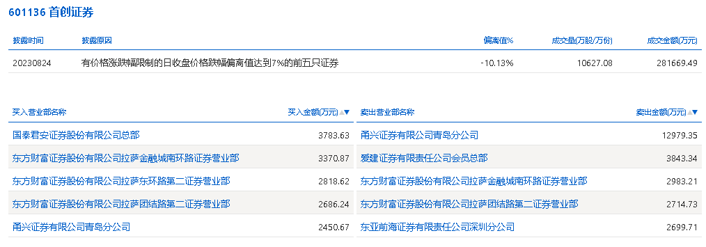 8月24日,首创证券今日跌停,龙虎榜数据显示,上榜营业部席位全天成交4.03亿元,占当日总成交金额比例为14.32%。其中,买入金额为1.51亿元,卖出金额为2.52亿元,合计净卖出1.01亿元。