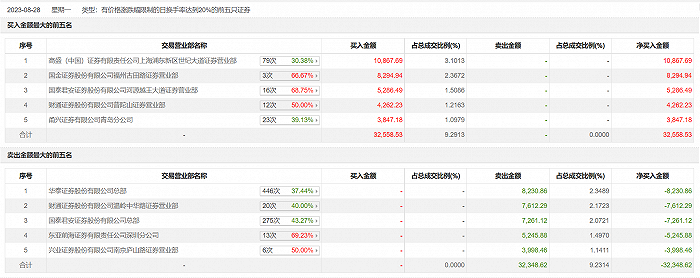 具体来看,高盛(中国)证券上海浦东新区世纪大道证券营业部、国金证券福州古田路证券营业部分别买入1.09亿元、8294.94万元;华泰证券总部、财通证券温岭中华路证券营业部分别卖出8230.86万元、7612.29万元。