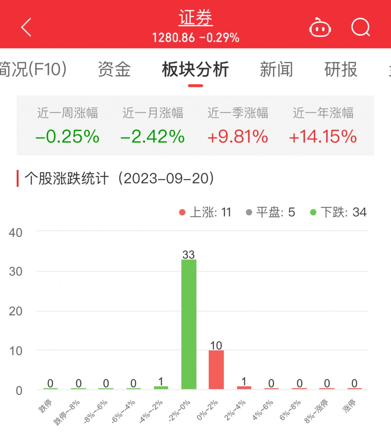 中国经济网北京9月20日讯 今日,证券板块整体跌幅0.29%,其中11只股票上涨,5只股票平盘,34只股票下跌。
