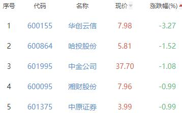 华创云信、哈投股份、中金公司、湘财股份、中原证券位列涨幅榜后五位,涨幅分别为-3.27%、-1.52%、-1.08%、-0.99%、-0.99%。