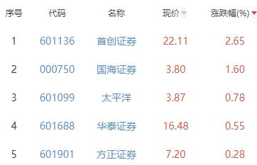 其中,首创证券、国海证券、太平洋、华泰证券、方正证券位列板块涨幅前五位,涨幅分别为2.65%、1.60%、0.78%、0.55%、0.28%。