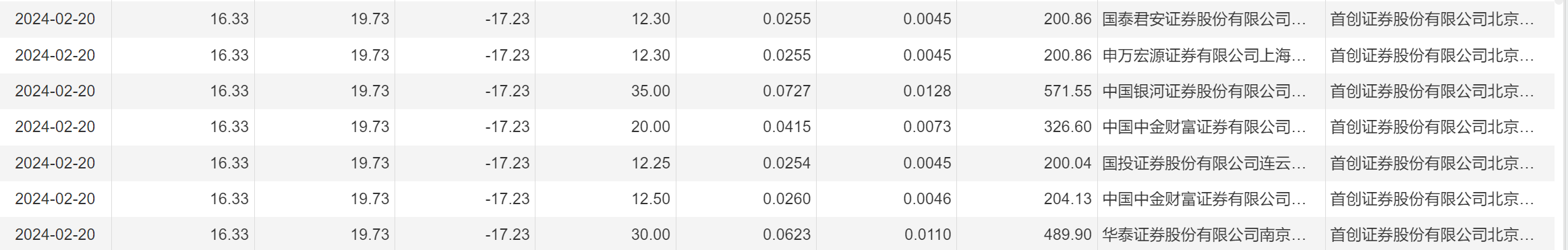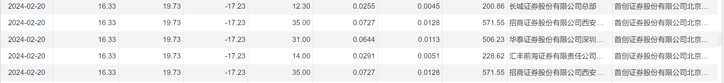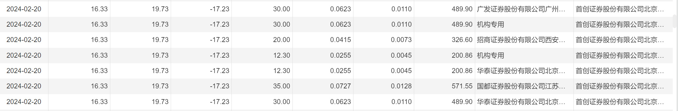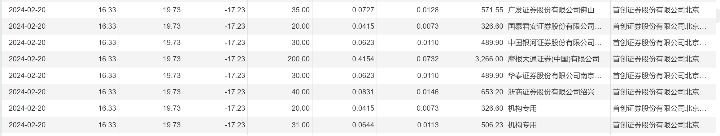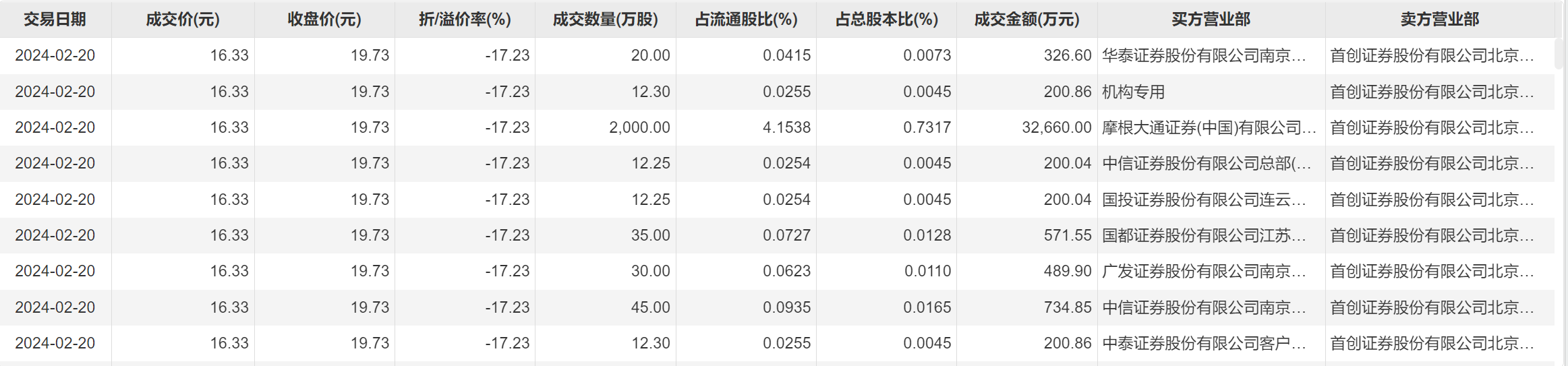 2月20日大宗交易成交3199.35万股,成交额5.22亿元,占当日总成交额的23.97%,成交价16.33元,较市场收盘价19.73元折价17.23%。
