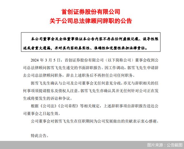 北京商报讯(记者 李海媛)3月5日,首创证券发布公告称,董事会收到公司总法律顾问郭雪飞递交的书面辞职报告。因工作调动,郭雪飞申请辞去公司总法律顾问职务,辞去上述职务后不再担任公司任何职务。