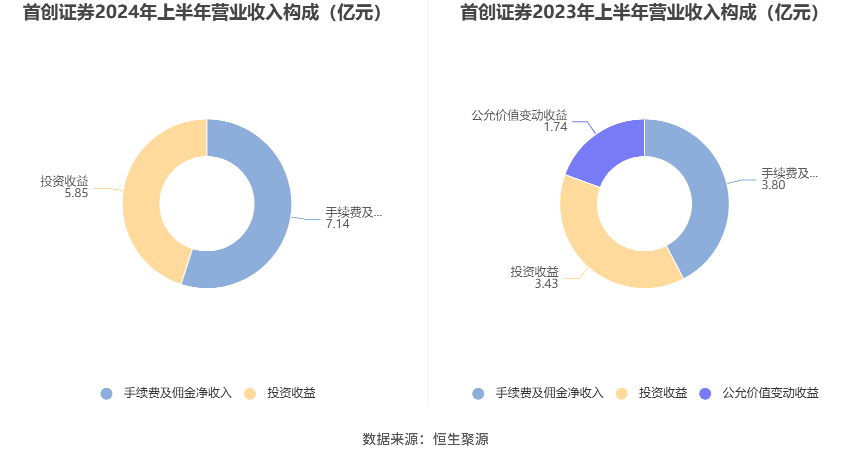 分产品来看,2024年上半年公司主营业务中,手续费及佣金净收入7.14亿元,同比增长87.97%,占营业收入的56.88%;投资收益5.85亿元,同比增长70.59%,占营业收入的46.62%。