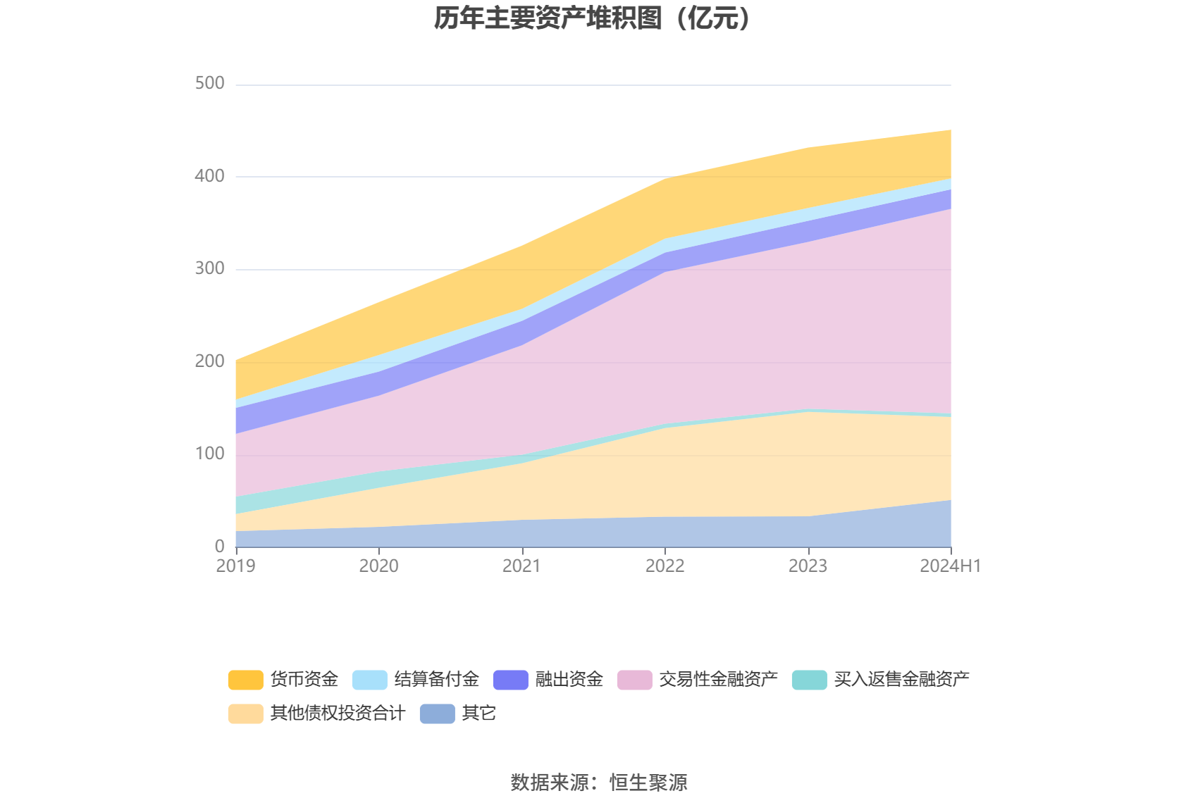 资产重大变化方面,截至2024年上半年末,公司交易性金融资产较上年末增加22.57%,占公司总资产比重上升7.25个百分点;其他债权投资合计较上年末减少20.51%,占公司总资产比重下降6.22个百分点;其他权益工具投资合计较上年末增加119358.44%,占公司总资产比重上升3.71个百分点;货币资金较上年末减少19.85%,占公司总资产比重下降3.52个百分点。