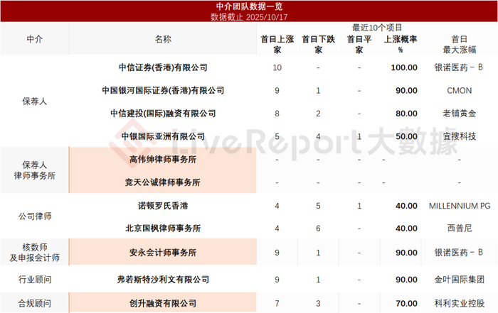 据LiveReport大数据统计,首创证券中介团队共计11家,其中保荐人4家,近10家保荐项目数据整体表现良好;公司律师共计2家,综合项目数据整体不足。整体而言中介团队历史数据表现一般。