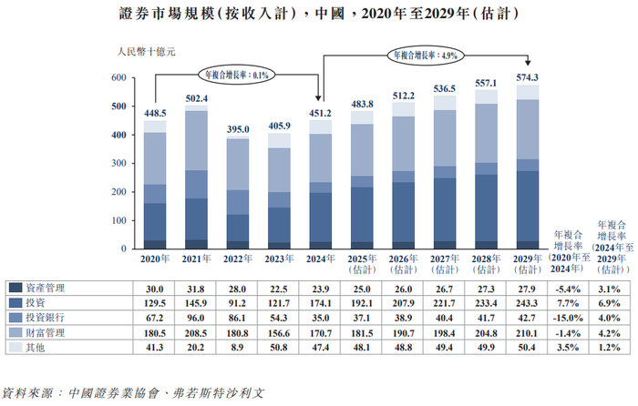 根据弗若斯特沙利文(Frost & Sullivan)的报告,以收入计的中国证券行业市场规模在2020年至2024年间从人民币4,485亿元增长至人民币4,512亿元,年复合增长率为0.1%。预计到2029年将增长至人民币5,743亿元,2024年至2029年的年复合增长率为4.9%。