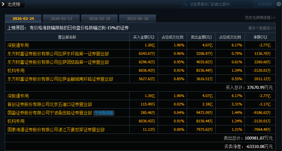 光线传媒(300251)今日20cm跌停,成交额65.98亿元,换手率10.76%,盘后龙虎榜数据显示,深股通专用席位买入1.30亿元并卖出4.07亿元,有1家机构专用席位净卖出2120.01万元。首创证券(601136)北京五道口证券营业部净卖出2.17亿元。