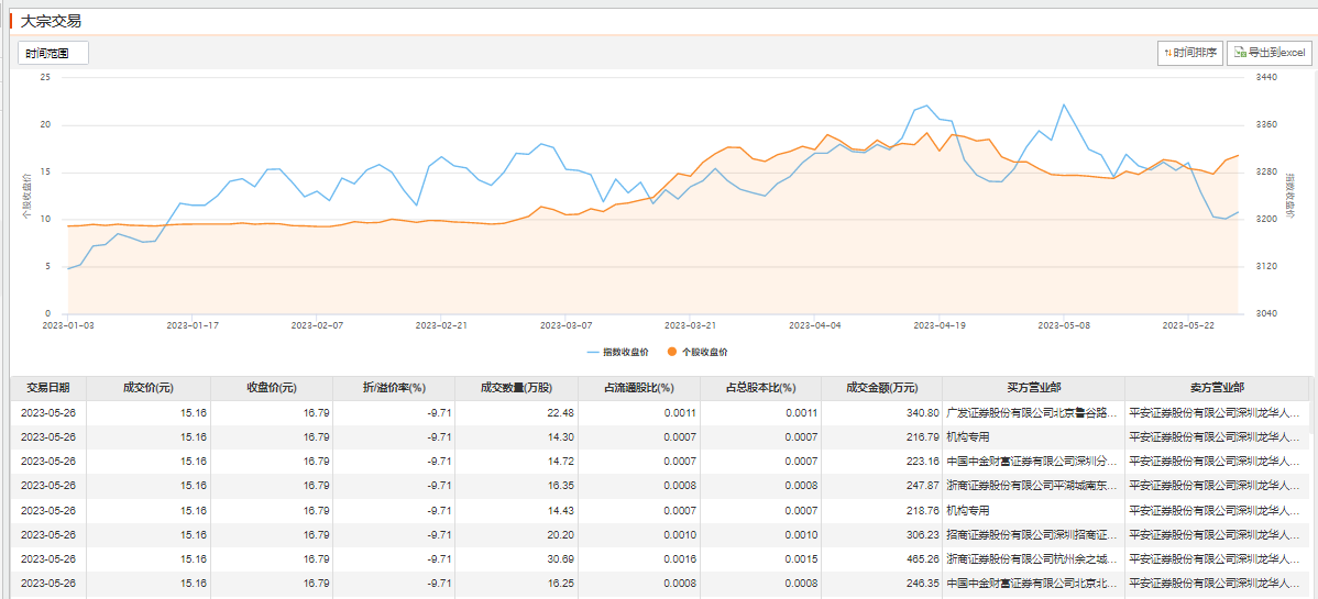 5月26日大宗交易成交2718.17万股,成交额4.12亿元,占当日总成交额的8.44%,成交价15.16元,较市场收盘价16.79元折价9.71%。