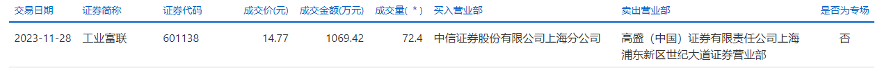 工业富联今日大宗交易成交1069.42万元,折价率2.51%