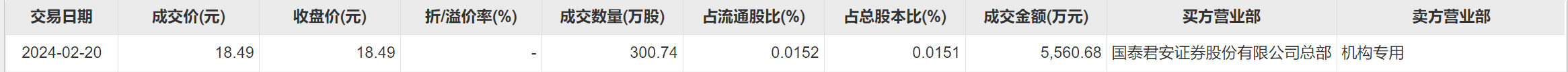 2月20日大宗交易成交300.74万股,成交额5560.68万元,占当日总成交额的0.99%,成交价18.49元,较市场收盘价18.49元持平。