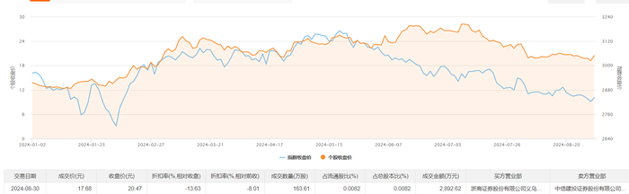 8月30日大宗交易成交163.61万股,成交额2892.62万元,占当日总成交额的0.74%,成交价17.68元,较市场收盘价20.47元折价13.63%。