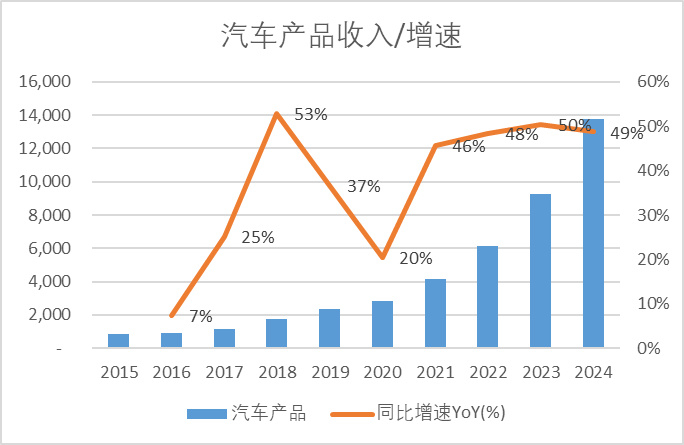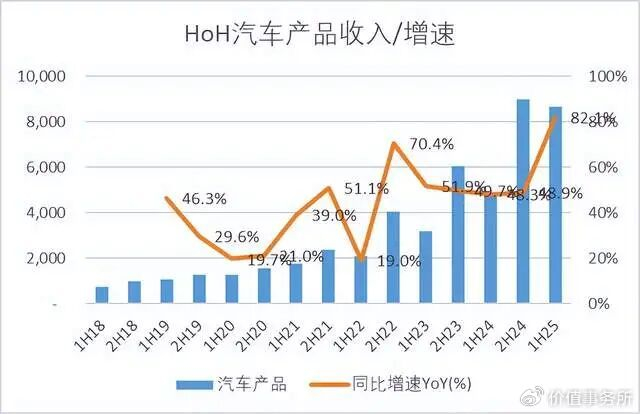 2025年上半年汽车产品部门的收入是87亿,同比+82.1%,占总收入的比重为7%,24年汽车产品部门的毛利率是16.1%,同比+0.2pct。