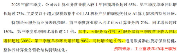 受益于AI算力需求的持续旺盛,2025年前三季度,工业富联云服务商GPUAI服务器业务营收同比增长超过300%,第三季度同比增长更是超5倍。