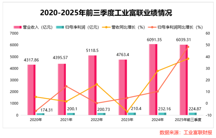 2025年前三季度,工业富联实现营收6039.31亿元,同比大增38.4%;净利润224.87亿元,同比飙升48.52%,均已接近2024年全年水平。
