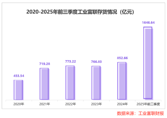 2025年前三季度,工业富联存货达1646.64亿元,同比猛增82.28%,创下同期以来的历史新高。