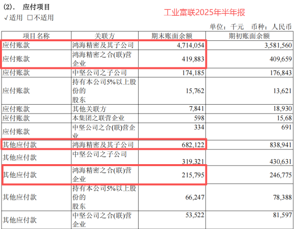 出身于富士康系的好处就在于,母公司鸿海精密系列公司之间能互帮互助。2025年上半年,工业富联与鸿海精密相关企业之间的应付款总额就高达50亿。